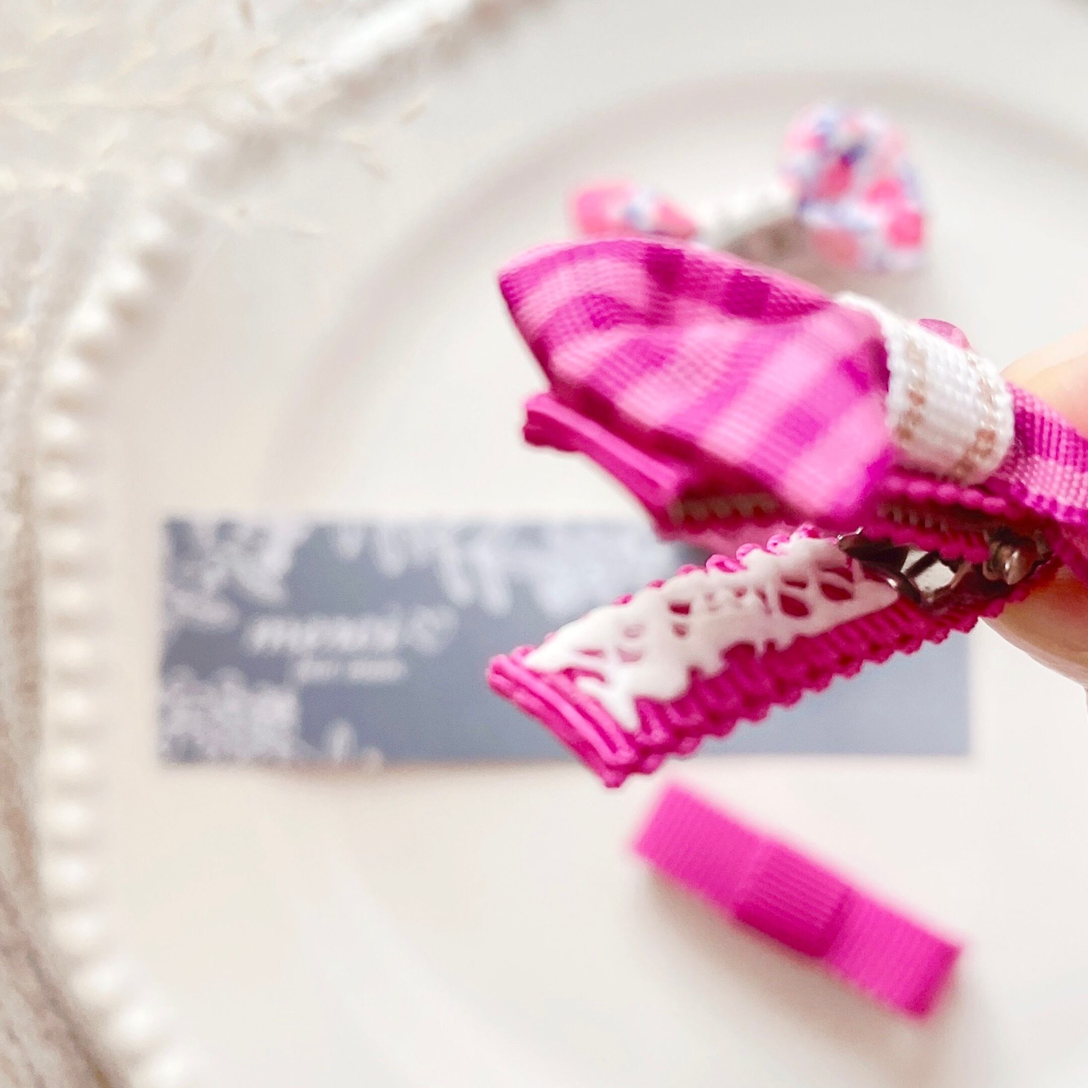 ラメ入りハートモチーフと、小花柄リボンに、チェック柄リボンと、シンプルなピンクリボンのヘアクリップ♡