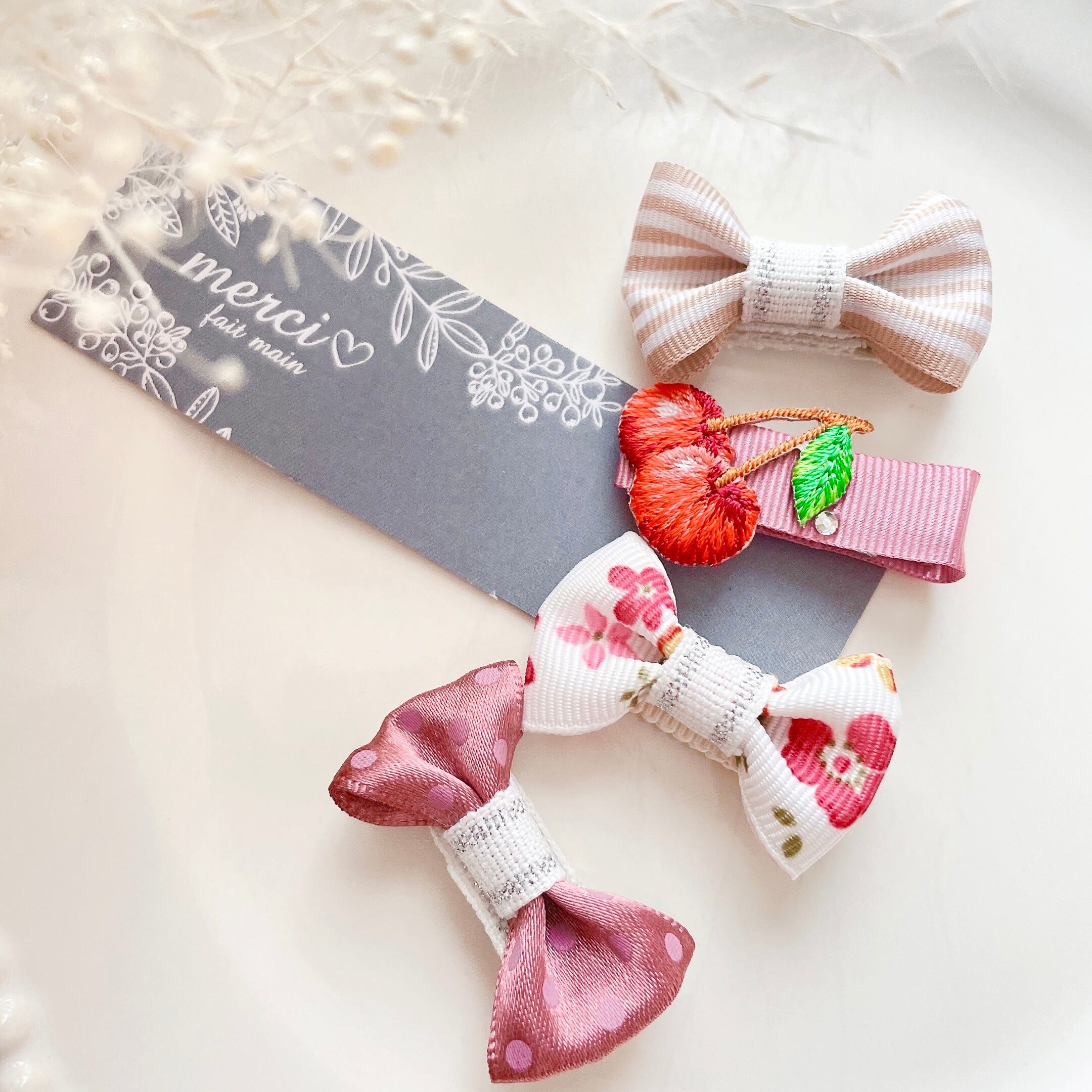 ベージュのボーダーリボンと、ヨーロッパ製のチェリーモチーフに、花柄リボンと、水玉リボンのヘアクリップ♡