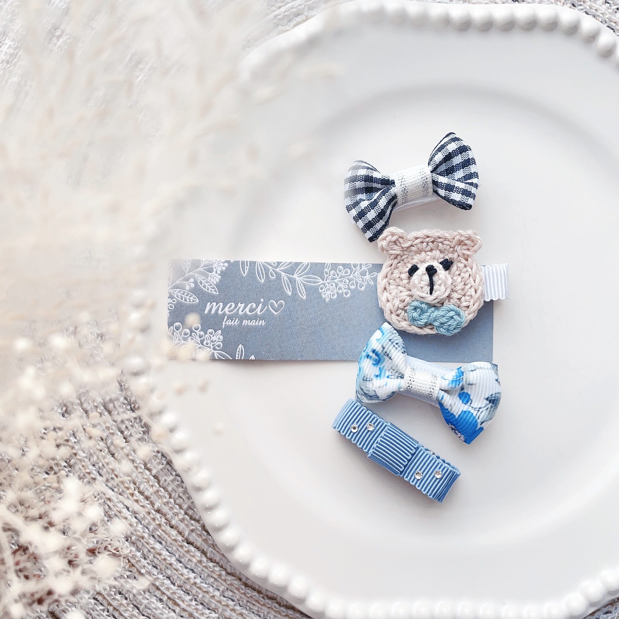 チェック柄リボンと、可愛いクマさんモチーフに、水色のお花柄リボンと、シンプルなくすみブルーのリボンクリップ♡